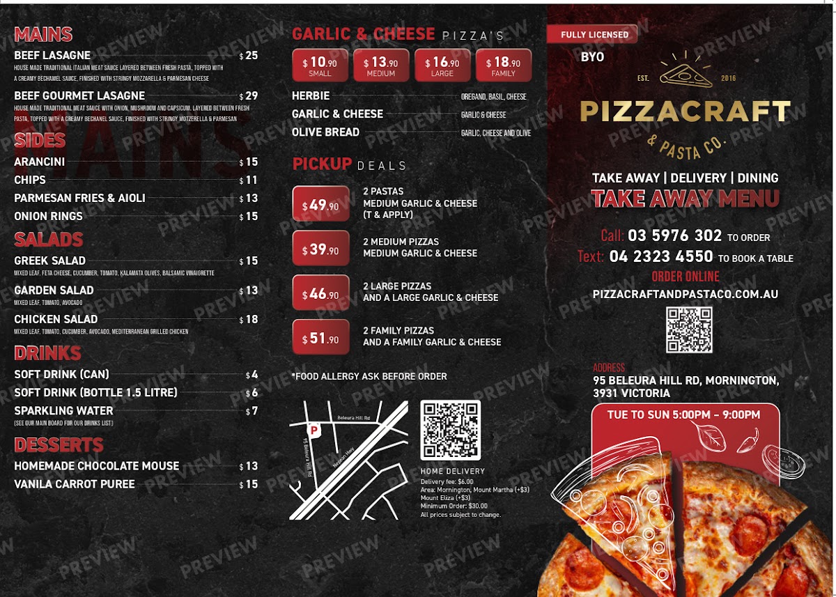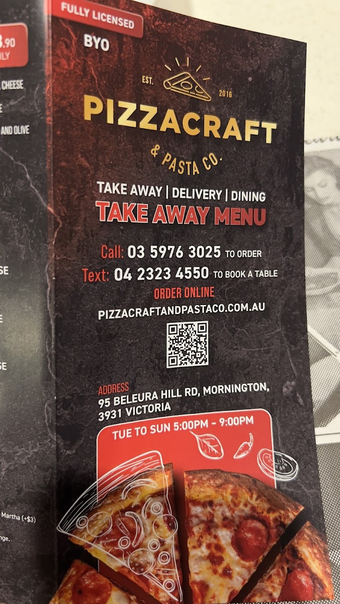 Welcome to Pizzacraft & Pasta Co., a hidden gem nestled in Mornington, where authentic Italian flavors come to life. This vibrant eatery offers a mouthwatering menu that features expertly crafted pizzas and delectable pasta dishes. Diners can indulge in options like the Nimbin pizza, toppings galore, or savor a rich, comforting lasagna and arancini balls that are both full of flavor.